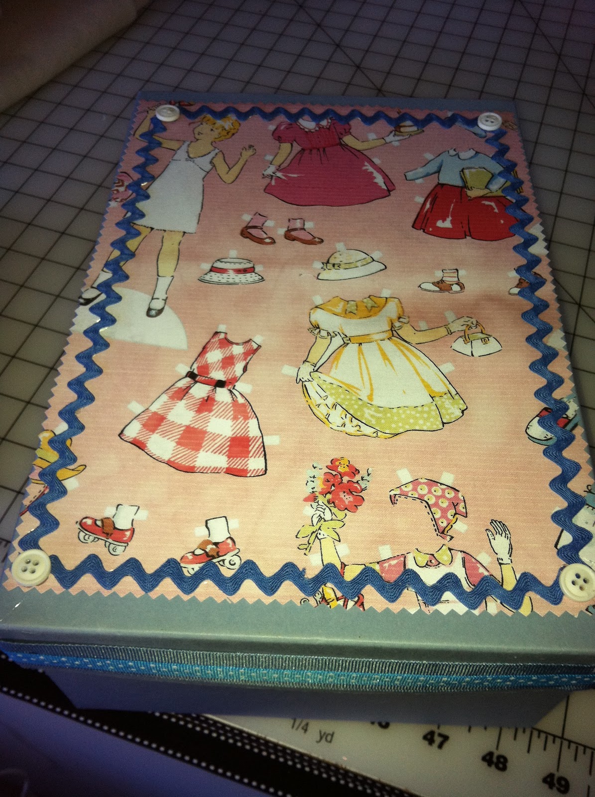 You are probably wondering why the last minute gift and why a box? Well, you see I gave my granddaughter a pretty 18” doll with several sets of doll clothes. I also bought her a doll trunk, for the clothes, which she will get for Christmas, but I did not think it through. Where was she going to put all the dolly clothes and shoes until then, they were going to get lost? I pulled out a blue photo storage box, her favorite color, some rick rack, buttons, ribbons and a photo copy of some really cute paper doll fabric and made up a temporary trunk for the doll accessories. She absolutely loved everything and has been playing with the dolly, clothes and storage box ever since. Mission accomplished, project completed, good job Grandma.